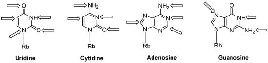 Recently, a significant interest has been observed in the use of modified oligoribonucleotides in the fields of molecular biology, biochemistry, and medicine [1,2,3]. The representative sites of RNA modifications are the 5′- and 3′-ends of oligoribonucleotides, and the 2′-positions of the ribose, phosphodiester residues, and nucleobase moieties. Notably, among 150 modified nucleosides identified in cellular RNA sequences, more than 95% of functional groups are installed in the nucleobase heterocycles (Figure 1) [4,5]. Improved mass spectrometry approaches and highly sensitive chemical screens in cellular RNA isolation are still extending this list with new base-modifying units, e.g., cyclic N6-threonylcarbamoyladenosines (ct6A, ms2ct6A) [6,7], 2-methylthiomethylenethio-N6-isopentenyl adenosine (msms2i6A) [8], uniquely lipophilic 5-substituted 2-geranylthiouridines (mnm5ges2U, cmnm5ges2U) [9] and 2-methylthiocytidine (ms2C) [10]. RNA modifications affect the structure, stability, and biological activity of RNA biomolecules, particularly the translation process [11]. Experiments of the site-specific incorporation of nucleic base modifications have proved to be a particularly useful method for precisely assessing the role of various functional groups in the structure, function, and biosynthesis of RNA molecules [12,13,14,15,16,17].