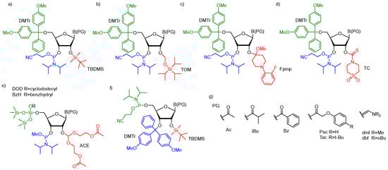 The most common ribonucleoside phosphoramidite building blocks for solid-phase RNA synthesis; (a) 5′-O-DMTr–2′-O-TBDMS–3′-O-(2-cyanoethyl-N,N-diisopropylphosphoramidite); (b) 5′-O-DMTr–2′-O-TOM–3′-O-(2-cyanoethyl-N,N-diisopropylphosphoramidite); (c) 5′-O-DMTr–2′-O-Fpmp–3′-O-(2-cyanoethyl-N,N-diisopropylphosphoramidite); (d) 5′-O-DMTr–2′-O-TC-3′-O-(2-cyano ethyl-N,N-diisopropylphosphoramidite); (e) 5′-O-DOD–2′-O-ACE–3′-O-(methyl-N,N-diisopropyl) phosphoramidite; (f) 3′-O-DMTr-2′-O-TBDMS-5′-O-(2-cyanoethyl-N,N-diisopropylphosphor-amidite)-reverse RNA phosphoramidite; (g) commonly used nucleobase protecting groups.