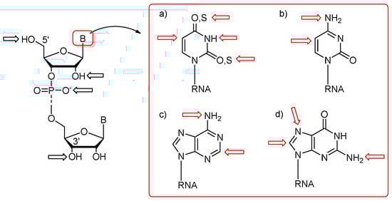 Representative sites of post-synthetic modifications present in sugar–phosphate backbone and nucleobase residues with the highlighting of uridine and thiouridine (a); cytidine (b); adenosine (c); and guanosine (d).