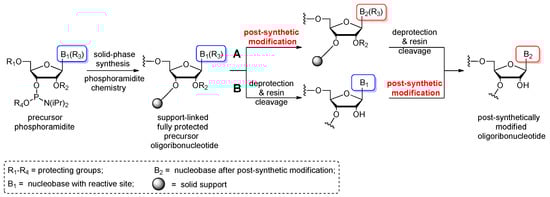 Post-synthetic conversions of RNA oligomers can be performed in the solid or liquid phase (Scheme 2). The “in solid-phase” approach involves a fully protected, support-attached oligoribonucleotide as a substrate for the post-synthetic reaction (Scheme 2A). After conversion, the oligomer is released from the resin and deprotected. Notably, the use of basic conditions for the transformation process can promote the simultaneous removal of exoamino and phosphate-protecting groups as well as the support cleavage. In these cases, the post-synthetic reaction is carried out in a one-step conversion–deprotection process. Occasionally, the separate deprotection of the phosphate groups is performed prior to post-synthetic conversion to avoid any side reactions of the oligomer with acrylonitrile released during removal of the β-cyanoethyl groups.