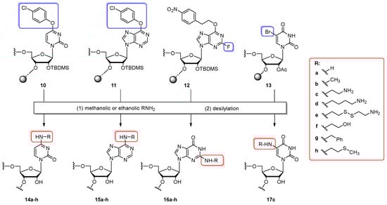 The first convertible oligoribonucleotides were reported by Verdine and co-workers in 1995 [66,67]. The post-synthetic strategy attended the exocyclic amino groups of A, C, and G nucleosides and was an extension of earlier Verdine’s lab studies on the convertible nucleoside approach in the derivatization of DNA oligomers [54,55,57,58,68]. Developed chemistry permits the site-specific incorporation of N-functionalizable nucleobases of A, C, and G into RNA and its further derivatization to e.g., crosslinked nucleic acids (see Scheme 27A). The authors demonstrated the use of 4-O-(4-chlorophenyl)uridine (1, see Figure 4), 6-O-(4-chlorophenyl)inosine (6), and 2-fluoro-6-O-(4-nitrophenylethyl)inosine (9) prepared as 5′-O-DMTr-2′-O-TBDMS-protected phosphoramidites to the synthesis of 11-nt precursor oligonucleotides 10–12 by standard 1 µmol phosphoramidite chemistry (Scheme 3). For use in the automated RNA synthesis, the convertible Verdine’s phosphoramidites were applied as 0.1 M solutions in acetonitrile, while the coupling time was extended to 12 min. Syntheses proceeded with average stepwise yields of ca. 97%. The following conversion–deprotection step of resin-bound oligonucleotides with primary alkylamines resulted in the substitution of chlorophenyl groups in aryl ethers (oligomers 10, 11) as well as 2-fluoride leaving groups in O6-protected inosine (oligomer 12) with amines providing N4-alkylcytidine-(14a–h), N6-alkyladenosine-(15a–h) and N2-alkylguanosine-modified RNAs (16a–h). To eliminate the base-promoted RNA degradation, the post-synthetic transformations were performed under anhydrous conditions using 7 M methanolic ammonia, 8 M solution of methylamine in ethanol, or 2 M methanolic solutions of other amines such as ethylenediamine, 1,4-diaminobutane, cystamine, ethanolamine, benzylamine, and 2-(methylthio)ethylamine. Reactions were performed at 42 °C for 12–18 h. After displacement, the mixture of oligomer and remaining amine reagent was separated from the support and then evaporated or eluted through a Dowex cation exchange column (NH4+ form). Subsequent desilylation involved TEA·3HF or 1 M TBAF/THF treatment. Target oligonucleotides were purified by denaturing PAGE, affording oligomers 14–16 in the relative conversion yields above 65%. Measurements of thermal stability of modified duplex RNA oligomers have revealed that in most cases, the presence of N-alkyl modification slightly reduces duplex stability. The exceptions were oligonucleotides carrying a tether with a “free” amine group (oligomers 14c–e, 15c–e and 16c–e) for which increased duplex stability was observed.