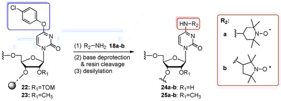 The support-bound, fully protected precursors 10 and 12 were incubated with 2 M solution of 4-amino-2,2,6,6-tetramethylpiperidin-1-oxyl (TEMPO-NH2, 18a) in methanol at 42 °C for 24 h providing fully converted N4-TEMPO-cytidine- and N2-TEMPO-guanosine-containing RNAs, respectively. However, the same transformation of O6-(4-chlorophenyl)inosine-oligomer 11 to N6-TEMPO–adenosine–RNA turned out incomplete even after a prolonged incubation time and temperature. All nucleobase substitutions were performed in one step with support cleavage and the deprotection of base-labile protecting groups. After desilylation, the TEMPO-substituted RNA oligonucleotides 19–21 were purified by anion-exchange HPLC or denaturing PAGE. The influence of TEMPO subsituents on RNA conformation and the secondary structure of the hairpin and duplex structure was investigated, demonstrating the potential of labeled oligomers as reporter probes in pulsed EPR spectroscopy. Although the resulting spin-labeled RNAs were obtained in good yields and high qualities, further work was undertaken to improve the preparation of the precursor oligomers. To this purpose, Verdine’s 4-O-(p-chlorophenyl)uridine building blocks protected with 2′-O-TOM or 2′-O-Me group were used in the place of commercially available 2′-O-TBDMS phosphoramidite (Scheme 5) [52]. This change significantly improved the coupling yields and shortened coupling times. In addition, 2′-OMe modification was expected to increase the stability of nitroxide-labeled oligomers. For post-synthetic transformations, fully protected, polystyrene-linked oligomers 22, 23 were incubated with a 2 M methanolic solution of TEMPO-NH2 (18a) or 3-amino-2,2,5,5-tetramethylpyrrolidin-1-oxyl (proxyl, 18b) at 42–55 °C for 24–48 h. Then, aq. MeNH2 or aq. NH3 were added to complete the cleavage of base-labile protecting groups (this step was skipped during the preparation of short TEMPO-labeled oligomers, which were deprotected simultaneously with displacement). Fully deprotected TEMPO- (24a, 25a) and proxyl-labeled oligomers (24b, 25b) ranging from 9 to 27 nt were purified by PAGE or anion-exchange HPLC. For proxyl-labeled RNAs 24b, 25b, the formation of an N4-methylcytidine-containing side product was observed, resulting from the substitution of the 4-O-chlorophenyl group in an unreacted precursor oligomer with methylamine. The nitroxide-labeled RNAs carrying TEMPO or proxyl were utilized to obtain functional 53-nt and 118-nt riboswitch RNAs by deoxyribozyme-catalyzed ligation as an alternative to protein-based RNA ligation [52].