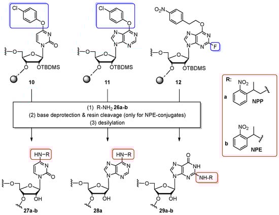 Commercially available 5′-O-DMTr-2′-O-TBDMS Verdine’s phosphoramidites were applied for the incorporation of photolabile 2-(2-nitrophenyl)propyl (NPP) and 2-(2-nitrophenyl)ethyl (NPE) “caging groups” (Scheme 6) [71]. Solid-phase syntheses of 15-nt precursor oligomers 10–12 were performed according to standard coupling protocol. For displacement reaction, fully protected and support-bound oligomers 10–12 were treated with 2.5 M NPP-NH2 (26a) in methanol (1–2 days, 25–42 °C) or NPE-NH2 (26b) in acetonitrile (2–5 days, 42–60 °C). The use of sterically hindered amine 26b required an extra cleavage step with methylamine or aq. NH3 for complete base deprotection. In the case of inosine-containing oligomer 11 the conversion with NPE–NH2 turned out not to work. Finally, oligomers containing both NPP and NPE groups were desilylated using TEA⋅3HF/TEA/NMP mixture. An attempt to prepare 4-O-caged uridine- and 6-O-caged adenosine-containing oligomers by incubation of 10, 11 with NPP–OH nucleophilic reagent (alcohol analog of NPP–NH2) in MeCN for 7 days at 42 °C (optionally in the presence of tertiary amine) proved to be ineffective. The presented methodology enabled simplifying the synthesis of caged RNAs (compared to the standard monomer approach), since the commercially available Verdine’s phosphoramidite was used. The expected results of duplex destabilization caused by attached caging groups were achieved.