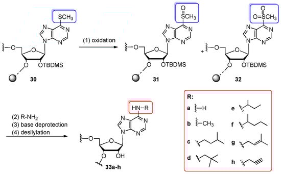 In 2003, Kierzek’s group employed 6-methylthiopurine riboside 7 (see Figure 4) and 2-methylthio-6-chloropurine riboside 8 as convertible nucleosides for post-synthetic nucleophilic aromatic substitution with primary alkylamines, leading to N6-alkyladenosine- and 2-methylthio-N6-alkyladenosine-modified oligoribonucleotides (7-, 8- and 17-mers), respectively (Scheme 7 and Scheme 8) [60]. Among them, four naturally occurring tRNA modifications i6A, m6A, ms2i6A, and ms2m6A were inserted. Both convertible oligomers 30 and 34 were synthesized automatically on 1 µmol scale by the standard protocol of phosphoramidite chemistry on solid support (CPG, Fractosil 500 or resins loaded with 5′-O-DMTr-2′-O-TBDMS-protected convertible nucleosides 7, 8). Before conversion, the 6-methylthio group (6-SCH3) of support-linked 6-methylthiopurine-modified oligoribonucleotide 30 (Scheme 7) was selectively and quantitatively activated by oxidation with a 20 mM solution of monoperoxyphtalic acid (magnesium salt form, 2.5 h, rt) yielding a mixture of oligomers 31 and 32 decorated with 6-methylsulfoxide (6-S(O)CH3) and 6-methylsulfonyl (6-S(O)2CH3) groups, respectively. The oxidized oligomers 31, 32 (still attached to the support) were reacted with various primary alkylamines. To get oligomers modified with N6-methyladenosine or N6-isopentenyladenosine, 2 M MeNH2 in THF (12 h, rt) and isopentenylamine hydrochloride with TEA in pyridine (12 h, 55 °C) were applied, respectively. Other amines, such as isoamylamine, neopentylamine, 1-methylpropylamine, 1-methylbutylamine, and propargylamine were used as a solution in acetonitrile (1:9 v/v) and left for 12 h at rt. After conversion, the samples were evaporated, and the aq. NH3/EtOH (3:1 v/v, 8 h, 55 °C) was added for the complete removal of the base-labile protecting groups. After desilylation, the fully deprotected oligomers were purified on silica gel plates. The overall yields of N6-alkyladenosine-containing RNAs 33a–h were in the range of 40–77% (13–34% for 17-mers). It was indicated that the synthesis yields were not dependent on the position of convertible nucleoside in the RNA sequence but on the steric hindrance and the nucleophilic character of the amino group in alkylamine conversion reagents.