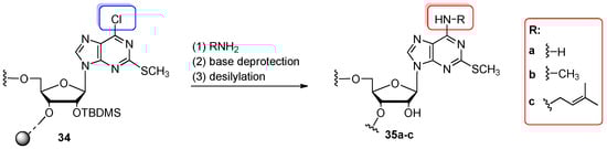 To prepare the 2-methylthio-N6-alkyladenosine-modified RNAs 35a–c (Scheme 8), several 6-substituted purine ribosides such as dinitrothiophenyl-, pentafluorophenyl-, and chloro-substituted purines were tested as model convertible nucleosides [60]. Among them, 2-methylthio-N6-chloropurine riboside 8 (see Figure 4) exhibited the highest reactivity with primary amines. Therefore, the 5′-O-DMTr-2′-O-TBDMS-protected convertible phosphoramidite of 8 was introduced into RNA sequences (7-, 8- and 17-mers) on the 1 µmol scale of the oligonucleotide synthesis. The trityl-off support-linked precursor 34 (Scheme 8) was treated with alkylamines: 2 M MeNH2 in THF (2–5 h, 55 °C) or isopentenylamine hydrochloride/TEA in pyridine (2–5 h, 55 °C). For complete removal of base-labile protecting groups, the samples were additionally treated with aq. NH3/EtOH (3:1 v/v, 8 h, 55 °C). Displacement of the 6-chloro group with –NH2 involved the aq. ammonia and prolonged reaction time (16 h, 55 °C). After desilylation, the fully deprotected oligomers were purified on silica gel plates. The overall yields of 2-methylthio-N6-alkyladenosine-modified oligoribonucleotides 35a–c range from 20% to 65% (16–24% for 17-mers).