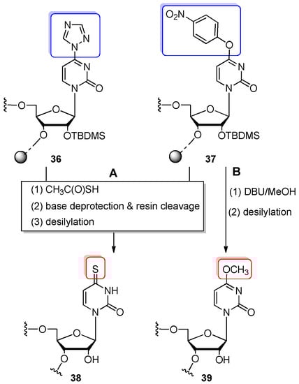 The use of 4-(1,2,4-triazol-1-yl)-2-pyrimidon-1-yl-β-D-ribofuranoside convertible nucleoside 5 was demonstrated by Shah and Kumar [74,75] (Scheme 9A). The 5′-O-DMTr-2′-O-TBDMS-protected phosphoramidite of 5 was incorporated into 5- or 7-nt oligonucleotides using standard phosphoramidite chemistry with more than 98% coupling efficiency. The trityl-off, CPG-linked precursor 36 was converted to s4U-RNA by treatment with 10% thioacetic acid (CH3C(O)SH) in acetonitrile (12 h, rt). Then, 10% DBU in methanol (16 h, rt) was used to release the oligomer from the support and to remove the base-labile protecting groups. The 2′-O-TBDMS groups were cleaved with TBAF to give the final s4U-RNA 38.