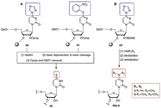 In 2004, Avino and co-workers prepared s4U-RNAs by the post-synthetic conversion of oligomers containing 4-triazolyl-pyrimidine riboside 40 and 4-O-(2-nitrophenyl)uridine 41 with sodium hydrogen sulfide NaSH (Scheme 10A) [76]. To avoid oligomer degradation under base conversion conditions, the 5′-O-DMTr-2′-O-Fpmp-protection system was applied for monomeric units. The 6- and 10-nt RNA oligomers were synthesized on a 1 µmol scale using CPG support. The trityl-on support-linked precursors 40 and 41 were treated with a 0.2 M NaSH solution in DMF (3 h, rt) to achieve complete displacement of the triazolyl group. Then, concentrated ammonia was added (4 h, 50 °C) to release the oligomers from the support and remove the base-labile protecting groups. The obtained trityl-on 2′-protected-RNAs were purified by RP HPLC and then treated with 10 mM aq. HCl (pH 2.5–3, 12 h, rt), yielding ca. 10 OD of the final s4U-oligomer 42. It was found that the triazolyl derivatives (phosphoramidite building block and precursor oligomer 40) have a limited shelf life (<3 months), while the 4-O-(2-nitrophenyl)uridine derivatives appeared significantly more stable (shelf life > 3 years).