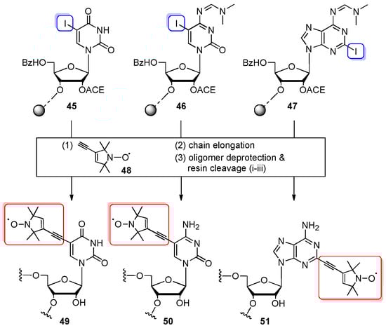 The post-synthetic Sonogashira coupling reactions were extensively exploited in the Engels group to construct the RNA oligomers with nitroxide spin labels [65,80,81,82] and pyrene fluorophores [83,84]. The authors described the attachment of spin label 2,2,5,5-tetramethylpyrrolin-1-yloxyl-3-acetylene (TPA) to 5-iodouridine or 2-iodoadenosine (both introduced as a 5′-O-DMTr-2′-O-TBDMS-protected phosphoramidites) by on-column derivatization using deoxygenated solutions of Pd(0)(Ph3P)4, CuI in DMF/TEA [80], or Pd(II)(PPh3)2Cl2, CuI in DCM/TEA [65,81]. However, the conditions typical for 5′-O-DMTr-3′-O-TBDMS phosphoramidite chemistry turned out to be harmful for TPA modification, particularly iodine in pyridine/water (used in oxidation step) and acidic conditions of detritylation. To eliminate this problem, the 5′-BzH-2′-O-ACE-protected monomeric units were used (Scheme 11). The combination of the mild tert-butylhydroperoxide oxidant with the neutral fluoride for 5′-O-BzH removal significantly improved the stability of the nitroxide spin label and increased the efficiency from 4–10% for TBDMS to 35–50% for ACE chemistry [65,82]. The ACE-protected phosphoramidites of 5-iodouridine, 5-iodocytidine, and 2-iodoadenosine were incorporated into 12-, 15-, and 16-nt RNA oligomers, on a 0.2 µmol scale synthesis. The key reaction of Sonogashira cross-coupling involved iodo-RNAs 45–47 (Scheme 11), TPA 48, and a solution of Pd(II)(PPh3)2Cl2 and copper (I) iodide in DCM/TEA (3.5:1.5 v/v) (the cross-coupling was performed twice to obtain quantitative yields). After 2.5 h, the column was reinstalled on the synthesizer to accomplish the synthesis of the RNA oligomer. Fully assembled RNA was subjected to deprotection and purified by anion-exchange HPLC.