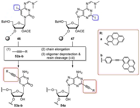 The combination of ACE phosphoramidite chemistry and Sonogashira coupling was applied for the preparation of pyrene-modified RNA oligomers 53a–b and 54a (Scheme 12) [83,84]. Two fluorophores, 1-ethynylpyrene 52a and 1-(p-ethynyl-phenylethynyl)-pyrene 52b, were attached by reaction with 5-iodocytidine- or 2-iodoadenosine-containing oligomers 46, 47 (prepared as 10- or 12-nt oligomers on a 0.2 µmol scale) and the solution of Pd(0)(PPh3)4, CuI in DCM/TEA by on-column synthesis. The coupling was performed twice for 2.5 h each to ensure quantitative reaction. Full-length oligomers were deprotected using a standard order of reactions. The crude oligomers were purified by IE HPLC, affording pure products 53a–b and 54a.