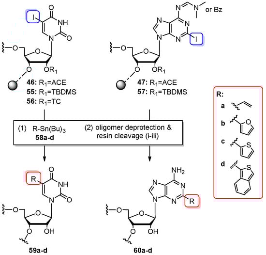 The on-column concept was applied by the group of Engels to the post-synthetic C–C bond-forming reaction via palladium-mediated Stille cross-couplings (Scheme 13) [85]. The feasibility of Stille coupling was tested for 5-iodouridine- and 2-iodoadenosine-RNA precursors prepared as 5- or 12-mers in three strategies: 2′-O-ACE (46, 47), 2′-O-TBDMS (55, 57), and 2′-O-TC (56) on 0.2 or 1 µmol scale. Iodo-oligomers were coupled with several tributylstannanes (RSnBu3, 58a–d) such as vinyl-, furyl-, thienyl-, and benzothienyl(tributyl)-stannane. In contrast to Sonogashira post-synthetic cross-coupling, the Stille reaction was performed on column after the completion of automated RNA synthesis. The synthesizer column with fully assembled RNA was connected with the column-syringe system that loaded the solution of tris(dibenzylideneacetone)dipalladium(0) (Pd2(dba)3, 15 equiv) and tri-2-furylphosphine (P(furyl)3, 30 equiv) in dry DMF and then a solution of alkylstannane (60 equiv) in DMF. The column with reaction solution was placed in the oven at 60 °C for 2–18 h. Then, the support-linked modified RNA (still closed in the synthesizer column) was washed, dried, and subjected to deprotection. The ACE-protected, polystyrene-bound oligomers were deprotected using the standard protocol. The TBDMS-protected, CPG-linked oligomers were treated with conc NH3/EtOH (3:1 v/v, 35 °C, 18–24 h) to cleave the base-labile protecting groups and resin, and then, they were desilylated. The TC chemistry was tested exclusively for 5-iodouridine-RNA. The CPG-linked/TC-protected oligomer enclosed in the column was treated with 20% Et2NH/MeCN (3 min, rt) to deprotect the phosphate groups. The residual blockage and CPG resin were cleaved with 50% solution of ethylenediamine in dry toluene (2 h, rt), and finally, fully deprotected RNA oligomer was eluted from the column with 0.1 M TEAA buffer. All obtained oligomers 59a–d and 60a–d were purified by IE HPLC. In a few cases, the desired products of Stille cross-coupling reactions were accompanied by reduced deiodinated RNAs or methylated side products.