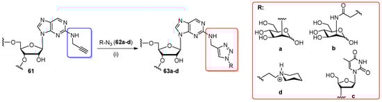 In 2010, the Beal’s group applied a post-synthetic CuAAC strategy to introduce N2-modifed 2-aminopurine ribonucleosides into an RNA chain to design RNA constructs for siRNA technology (Scheme 14) [35,91]. A 2-propargylaminopurine ribonucleoside was converted to 5′-O-DMTr,2′-O-TBDMS β-cyanoethyl phosphoramidite and incorporated into 12- and 21-nt RNA oligomers by solid-phase synthesis. After deprotection, alkynyl oligomer 61 was conjugated with 2-azido-2-deoxy-D-mannose (62a), N-azidoacetyl-D-mannosamine (62b), 3′-azidothymidine (AZT, 62c), or azide of N-ethylpiperidine (62d). Click products 63a–d were generated by incubating an aqueous solution of RNA oligomer 61 with the water-soluble tris-[1-(3-hydroxypropyl)-1H-[1,2,3]triazol-4-yl)methyl]amine Cu(I)-stabilizing ligand (THPTA), CuSO4, and sodium ascorbate (system for an in situ generation of catalytically active Cu(I) species), and azide 62a–d (5 equiv) for 4 h at ambient temperature. Complete conversions were observed for primary azides 62b,62d; however, the use of secondary azides 62a,62c reduced conversion yields by 50%. Click products 63a–d were purified by denaturing PAGE and confirmed by ESI-MS. Azide 62b was also effectively employed for the post-synthetic preparation of the di-click 21-nt RNA oligomer. Thermal denaturation studies indicated that oligomers 63b–d showed similar base pairing stability and specificity to adenosine-containing counterparts. [35,91]. Click products 63b and 63d displayed reduced binding affinity to off-target proteins (RNA-dependent protein kinase and adenosine deaminases), while RNAi activity was maintained [35].
