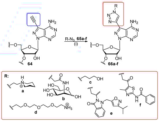 Post-synthetic CuAAC reaction of 7-ethynyl-8-aza-7-deazaadenosine-RNA (64) with azides 65a–f. Reagents and conditions: (i) THPTA, CuSO4, sodium ascorbate, 0.05 M solution of 65a in 0.5 M Tris-HCl (pH 8.0), 0.5 M or 0.15 M solution of 65b–d in water or 0.15 M solution of 65e–f in DMSO, rt (35 °C for 65f), 6.5 h.