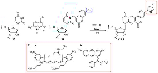 Kellner and co-workers employed click chemistry to label unmodified RNAs with fluorescent dyes (Scheme 16) [92]. For successful labeling, the unmodified RNAs 67 (prepared as synthetic RNA oligomers or yeast tRNAPhe in vitro transcript) were incubated with bifunctional azido-bromo-coumarin 68 in denaturating conditions (70% aq. DMSO, pH 8.5, 37 °C, 3 h) to provide products 69 with chemoselectively N3-alkylated uridine. The azidocoumarin-modified RNA 69 was subjected to click conjugation with fluorescent alkyne-containing AlexaFluor 647 (70a) or fluorescein (70b) in buffer of pH = 8, in the dark, using Cu+ (generated in situ from sodium ascorbate and Cu2+) with a THPTA ligand (rt, 2 h). Click products 71a–b were analyzed by PAGE electrophoresis.