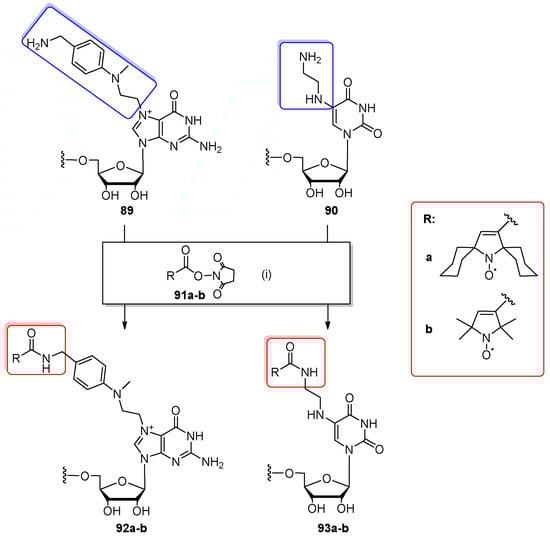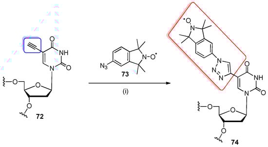 Post-synthetic spin labeling of RNA oligomer 72 with the azide-functionalized nitroxide 73 by click chemistry. Reagents and conditions: (i) CuI, THPTA, DMSO-H2O, 30 min, 37 °C.