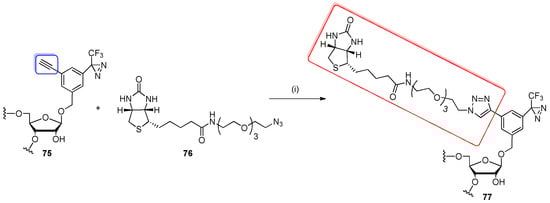 Post-synthetic Cu-catalyzed azide-alkyne cycloaddition of oligomer 75 with biotynyl-TEG-azide 76. Reagents and conditions: (i) sodium ascorbate, tris[(1-benzyl-1H-1,2,3-triazol-4-yl)methyl]amine (TBTA), CuSO4, DMSO, 0.2 M phosphate buffer (pH 7.0), rt, 1 h.