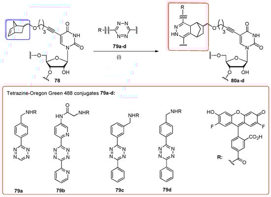 Beyond the CuAAC cycloaddition, the inverse electron demand Diels-Alder reaction (iEDDA) was employed for the post-synthetic labeling of norbornene-containing RNA oligomer 78 with disubstituted 1,2,4,5-tetrazine-fluorophore derivatives 79a–d (Scheme 19) [94]. The fast conjugation between the ring-strained olefin group as a dienophile and highly electron-deficient 1,2,4,5-tetrazine as a diene was discovered by the Fox and Hilderbrand groups in 2008 [95,96]. To demonstrate the use of iEDDA strategy in the post-synthetic labeling of RNAs, the norbornene modification was introduced into three different oligoribonucleotides (12-, 21-, and 24-mers) using 5-norbornene-modified 5′-O-DMTr-2′-O-TBDMS uridine phosphoramidite and standard conditions of RNA synthesis. Deprotected oligomers 78 were conjugated with a 2- or 3-fold excess of tetrazine-fluorophore derivatives 79a–d containing the fluorophore Oregon Green 488 in aqueous solution (rt, 1 h). Cycloaddition products were identified by PAGE and MS analysis. It was indicated that the overall yields of cycloaddition reactions were comparable regardless of norbornene position (the single- or double-stranded regions of RNAs). However, they were dependent on the steric effects of the disubstituted tetrazine derivatives with the RNA oligomer (reduced yields were observed for cycloadditions with tetrazines 79c,d). A bioorthogonal reaction of iEDDA between tetrazine-fluorophore 79a and 21-nt norbornene-modified RNA 78 (prepared as a siRNA duplex) was effectively performed in mammalian cells. In contrast to already known techniques, the fluorophore can be attached to RNA after the target binding, which minimizes the distortion of RNA transport and the functions in the cells.
