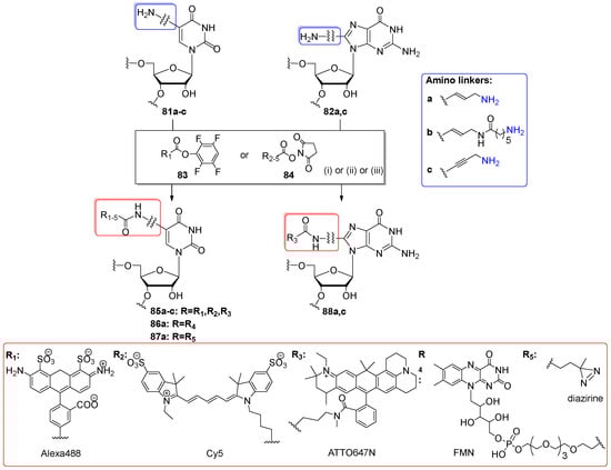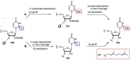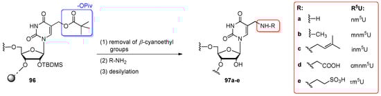 The post-synthetic strategy of RNA modification has several important advantages in comparison to the classical modified monomer approach. Firstly, one single modified precursor oligoribonucleotide can provide several sequentially homologous, variously modified RNA fragments [60,61,62]. Such a strategy significantly reduces the cost of synthesis compared to preparing each modified monomeric unit separately. Secondly, hypermodified monomeric units containing highly reactive groups e.g., –COOH, -SO3H, -CHO can be replaced by structurally convenient, easy convertible precursor phosphoramidites deprived of problematic functional groups [62]. Finally, the post-synthetic strategy permits introducing nucleosides/labels that are sensitive to the conditions of solid-phase synthesis and/or oligomer deprotection [63,64,65]. In some cases, the use of post-synthetic protocol proved to be the method of choice [63,64].