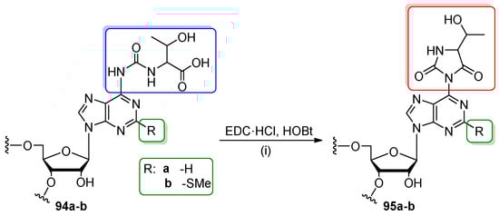 - Matuszewski, M.; Debiec, K.; Sochacka, E. Efficient conversion of N6-threonylcarbamoyladenosine (t6A) into a tRNA native hydantoin cyclic form (ct6A) performed at nucleoside and oligoribonucleotide levels. Chem. Commun. 2017, 53, 7945–7948. [Google Scholar] [CrossRef] [PubMed]