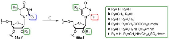 - Chwialkowska, A.; Wielgus, E.; Leszczynska, G.; Sobczak, M.; Mikolajczyk, B.; Sochacka, E.; Nawrot, B. An efficient approach for conversion of 5-substituted 2-thiouridines built in RNA oligomers into corresponding desulfured 4-pyrimidinone products. Bioorg. Med. Chem. Lett. 2015, 25, 3100–3104. [Google Scholar] [CrossRef]