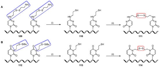 - Allerson, C.R.; Verdine, G.L. Synthesis and biochemical evaluation of RNA containing an intrahelical disulfide crosslink. Chem. Biol. 1995, 2, 667–675. [Google Scholar] [CrossRef]