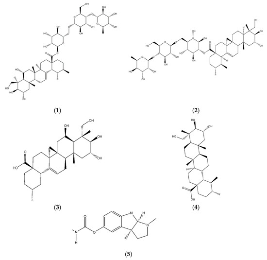 Triterpenes identified in Centella asiatica (L.) Urban (CA) (1) madecassoside; (2) asiaticoside; (3) madecassic acid; (4) asiatic acid; (5) eserine.