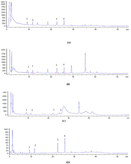 Chromatogram of standardized extracts of CA accessions; SECA-K017 (A), SECA-K018 (B), SECA-K019 (C) and reference standards mixture (D). (1) madecassoside; (2) asiaticoside; (3) madecassic acid; (4) asiatic acid.