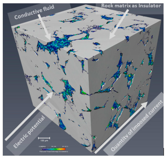 A 3D view of a rock showing the boundary conditions and components of the electrical conductivity.
