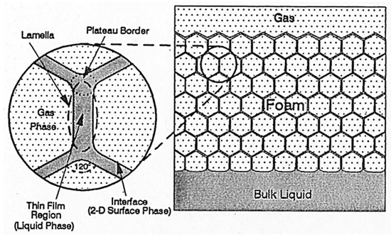 In recent years, more than half of the world’s hydrocarbon reserves have exceeded their maturity age, and their hydrocarbon production is rapidly declining. For such reservoirs, enhanced or tertiary hydrocarbon recovery methods are being considered. Such methods include injection of gas or chemicals (e.g., surfactants, polymers, CO2) to alter the surface tension [11,12], rock wettability, and capillary pressures. An effective alteration of the wettability and capillary pressures can significantly improve hydrocarbon recovery from tight reservoir pores that were initially un-swept during secondary recovery. In reservoirs with sections having varying ranges of permeability, the combined injection of surfactant and gas is used to generate foams that can prevent the injected gas from flowing only through the high-permeability sections. In other applications, foam is used to enhance gas injection and storage in underground reservoirs [13,14,15,16,17,18] or to have a better control of the injected fluids during the underground remediation process of contaminated soils and aquifers [19]. There are two general ways to generate foam in porous rock. One way is through the alternate injection of surfactant with gas, a process often referred to as surfactant-alternating gas [20]. Another method involves simultaneous or co-injection of the foaming solution and gas [21]. The generated foam bubbles can make a significant part of the gas phase discontinuous by thin liquid films called lamellae, separating the gas bubbles [22,23,24]. Figure 2 illustrates the components of a bulk foam.