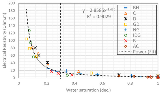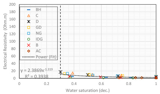 Power-law relationship between electrical resistivity and water saturation in a gas–water system.