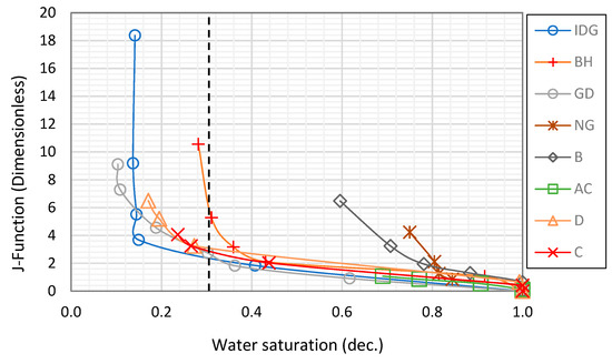 We start by combining all eight rock samples to form a heterogeneous composite rock having a wide variety of permeability and pore geometry. Figure 3 and Figure 4 show the resistivity data versus water saturation for the composite for the pure gas–water and foamed gas–water system, respectively. The markers in each figure represent the measured data for the different rock samples that make up the composite. We then fit a power-law curve (the black dotted curve), which is the line of best fit based on the least-squares method, to the composite data, for the pure gas–water system (Figure 3) and foamed gas–water system (Figure 4). As can be observed in both figures, the irreducible water saturation (the lowest water saturation attained after displacement) for the composite rock is 0.3 (for pure gas–water system) and 0.05 (for foamed gas–water system). This is expected as foam helps to divert gas bubbles into smaller pores that could not be drained by pure gas (normally due to gravity override) and drain the water therein [25,27]. The vertical dotted lines in both figures represent the 0.3 irreducible saturation obtained with pure gas. For the foamed gas displacing water (Figure 4), the electrical resistivity of the composite rock begins to increase rapidly as the water saturation drops below this critical value (0.3). As seen in the figure, the curve kinked at this saturation value and rapidly concaved upwards. The resistivity significantly increased from about 20 to 126 Ω-m. The reason for this observation is the high resistance to electric current caused by the foam bubbles, which is higher than the electrical resistance caused by gas without foam. As pointed out earlier in the introduction (Figure 2), foam bubbles consume some of the continuous water phase in the rock to form their lamellae. The water in the lamellae provide a smaller cross-sectional area to the flow of electric current compared to the continuous water channel present in the pores. As the number of bubbles increases, the fraction of the rock water used to form foam lamellae also increases while the fraction of the less tortuous water phase decreases. This, in turn, increases the tortuous path for current flow. Below a critical water saturation, when the foam texture becomes very fine (i.e., high bubble density), the resistivity curve rapidly increased and concaved upward, as observed in Figure 4. This critical water saturation is likely dependent on the pore geometry as the foam texture tends to be finer when the foam enters tighter pores with higher capillary pressures, as shown by the J-function plots for the composite in Figure 5. The J-function attempts to average or lump the capillary pressure curves of the component rocks by accounting for the effect of porosity and permeability that would otherwise cause the curves to be different for rocks of the same rock type. As seen in the J function plots of Figure 5, the 0.3 critical water saturation (black dotted vertical line) demarcates the region of high capillary pressure (left of the vertical line) from the region of lower capillary pressures (right of the vertical line) in the composite. There appears to be two classes of J-function. The first class consists of samples BH, D, GD, NG, IDG, and AC, which can be described by a single J-function, while samples B and C appear to form another class of pore geometry. The first class of samples was generally drained below the critical water saturation (below 0.3), where the electrical resistivity begins to concave upwards. The second class of samples appeared to have a different critical saturation value (approximately 0.8).