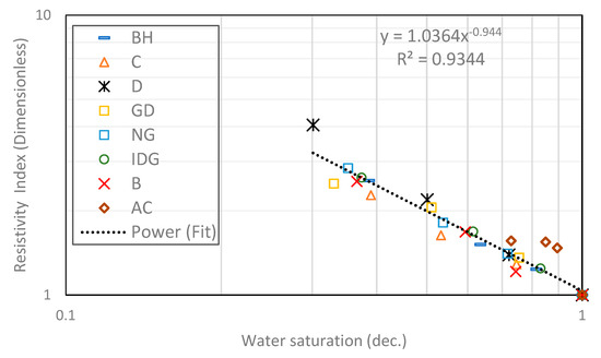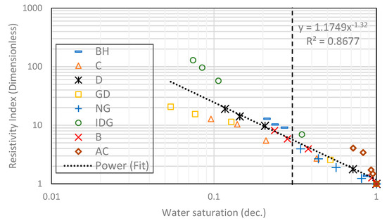 where RI is the resistivity index (a ratio of the rock resistivity at a given partial water saturation to the resistivity at 100% water saturation, ), is the water satution, is the resistivity of the porous medium when fully saturated with the conducting fluid, and is the resistivity of the porous medium when partially saturated at . The slope of the straight-line plot of Equation (1) or (2) gives the saturation exponent of the rock, of the rock sample, and the average of multiple measurements of represents the saturation exponent of an underground reservoir of similar rock type. This value is then used to convert the well log resistivity profile, obtained along a well drilled through the underground reservoirs or aquifers, into a saturation distribution profile. Various factors affect the value of the saturation exponent such as wettability, pore geometry, saturation history, rock–fluid interactions, and others as reported in the literature [3,4,5,6,7,8,9].