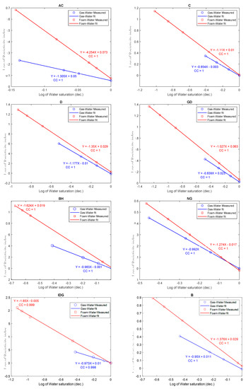 In this subsection, we examined the effect of foam on the individual rock samples. Figure 8 shows Archie’s model fitted to the measured resistivity index data, for both gas–water and foamed gas–water in each of the rock samples. It can be observed that the resistivity index at a given water saturation is higher in a foamed gas–water than in a gas–water system. Nonetheless, as seen in Figure 8, the relationship between the resistivity index in the foamed gas–water system can be fitted with Archie’s resistivity model (Equation (2)). The effect of foam is described by the values of the saturation exponent (slope). Hence, a higher resistivity index resulted in a higher saturation exponent in foamed gas–water than in gas–water systems. This is consistent for all the eight different samples measured. Table 1 tabulates the saturation exponents of the different rocks and the composite for both gas–water and foamed gas–water systems.