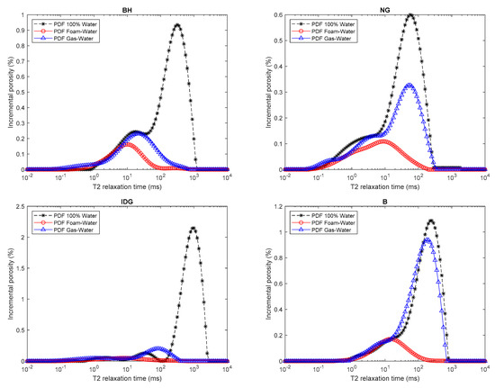 In this subsection, we used NMR relaxometry to study the distribution of water in the rock samples at three different states, namely, 100% water saturation, after gas displaced water, and after foamed gas displaced water. NMR measurements were plotted as a probability density function (PDF) of the relaxation time (T2). The PDF plot is related to the pore size distribution of the rock according to Equations (6) and (7).