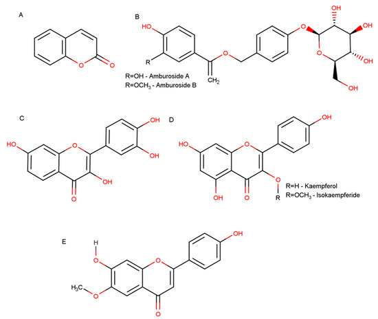 Representative chemical structures of A. cearensis bioactive compounds. (A) Coumarin (1,2-benzopyrone); (B) phenol glucosides amburoside A and amburoside B; (C) fisetin; (D) flavonoids kaempferol and isokaempferide; (E) flavonoid afrormosin.