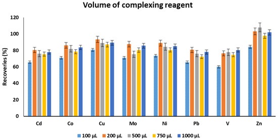 The volume of the complexing reagent is an important parameter as it can significantly impact the recoveries of the target metals. The volume of the complexing reagent should be enough to form the complexes with available metals in the aqueous solutions. Thus, different volumes of the complexing reagent in the range of 100–1000 µL were investigated. The best extraction recoveries were achieved using 200 µL except for V and Zn. However, the difference was not very substantial. Thus, 200 µL was selected as an optimum volume for complexing reagent for subsequent experiments (Figure 2). This result indicates that 200 µL of complexing reagent is enough for the metal complexation, and any additional amount will not improve the recoveries instead a slight decrease was observed. The accurate reason for this slight decrease in recoveries is not known, but it might be due to the competitive extraction of non-chelated complexing reagent into the extraction solvent.