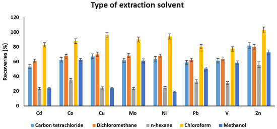 The selection of a suitable extraction solvent is critical to extract chelated metal complexes. In this work, different solvents, namely carbon tetrachloride, dichloromethane, n-hexane, chloroform, and methanol, were studied. As can be seen from Figure 4, the best extraction results were achieved using chloroform. The recoveries were in the following order: dichloromethane > carbon tetrachloride > methanol > n-hexane with some exceptions. Chloroform showed a high affinity toward chelated metal complexes compared to other solvents. Based on the highest recoveries, chloroform was selected as an optimum extraction solvent.