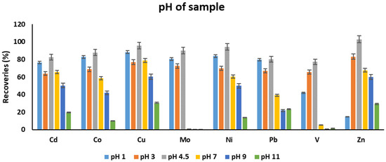 The pH of the sample solution is an important parameter for the extraction of metals because metals can exist in different forms at different pH. At the low pH values, metals usually exist in cationic form. In contrast, at higher pH values, metals do exist as their hydroxides, and precipitation may occur in the case of some metals. Apart from this, a suitable pH is the one where metal ions can form complexation with the selected chelating reagent. Thus, the analyte recoveries were determined in the pH range of 1–11. The order of recoveries was as follows: 4.5 > 1 > 2 > 7 > 9 > 11. The recoveries were increased from pH 3 to pH 4.5. After pH 7, a decreasing trend was observed (Figure 5). This may be attributed to the formation of metal hydroxides that limits the formation of metal-chelating reagent complex. Unexpected behavior was observed at pH 3. A pH value of 4.5 was found as an optimum one. The recoveries of some elements like Mo and V were substantially lost at higher pH values.
