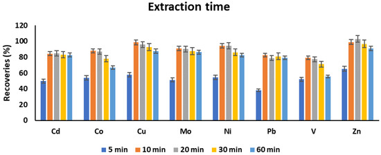 Extraction time was investigated in the range of 5–60 min. The highest analyte recoveries were obtained at 10 min extraction time, and then a steady state was achieved for the majority of the analytes except for Zn and V, for which a decrease in recoveries was recorded at 60 min (Figure 6). Although no experimental evidence can be provided, it seems extremely longer shaking times may result in slight leaching of some metals from the chelated complexes. Thus, 10 min extraction time can be selected as an optimum extraction time.