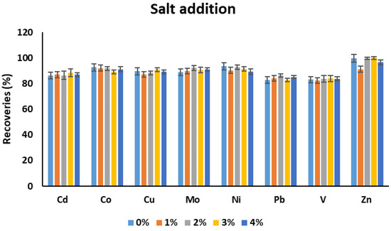 The effect of salt addition on the recoveries of metal was investigated (Figure 7). The amount of salt was investigated in the range of 0–4%. No significant difference was observed on the recoveries of the metal with addition of different amounts of NaCl. The salt concentration up to 4% was investigated to have a closer resemblance with the real seawater.