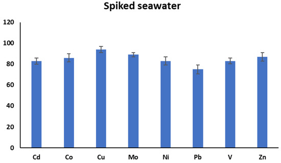 In order to check the applicability of MILLE into the complex samples, the recoveries of analytes from spiked seawater samples were calculated. For this purpose, three unspiked and three real spiked seawater samples were extracted under the optimum extraction conditions. The mean recoveries of unspiked samples were subtracted from the mean recoveries of spiked samples. As can be seen from Figure 8, the recoveries of the spiked samples were in the range of 75–94%. This indicates that the method is equally applicable to the extraction of selected metals from seawater. The recoveries from aqueous solutions and seawater were very close to each other, implying a negligible matrix effect.