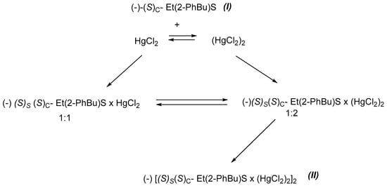 Upon addition of the chiral non-symmetric sulphide (I) to a concentrated solution of mercury(II) chloride in ethyl alcohol at room temperature, the new diastereoisomeric complex with mercury(II) chloride, (−)[(S)S(S)C-Et(PhBu)S.(HgCl2)2]2, (II), was instantaneously formed. The molar optical activity of the isolated complex in ethanol was [α]D = –2.4. This value grows upon addition to the solution of an excess of mercury chloride, thus showing the progressive formation of a new stereogenic centre in the molecule.