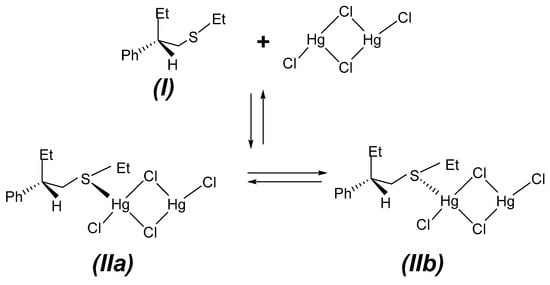 The addition of mercury(II) chloride to the optically active sulphide (I) may yield two diastereoisomers, (S)S(S)C -, (IIa), and (R)S(S)C-Et(PhBu)S∙(HgCl2)2, (IIb), where R or S refers to the absolute configuration of the sulphur and carbon atom, C(3), of the sulphide. The metal could bind to the prochiral sulphur atom from two different directions and create the two diastereoisomers, as shown in Scheme 2, crystallizing by an asymmetric second order process as (S)S(S)C-Et(PhBu)S.(HgCl2)2, (IIa), examined by X-ray.
