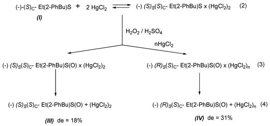 The last oxidation shows that mercury chloride bonding sulphur atom with the (S)S absolute configuration cooperates significantly to the asymmetric synthesis of (−)(R)S(S)C-Et(PhBu)SO, (IV), driving the oxidation on the enantiotopic site of prochiral sulphur atom.