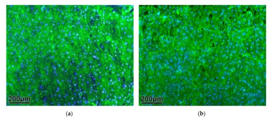 Immunofluorescence microscopic (IF): numerous cells attached to the coated (a) and uncoated (b) grid surface are visible due to actin immunofluorescence (green).