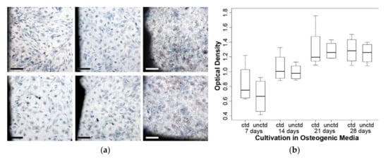 With the help of the MTT (3-(4,5-dimethylthiazol-2-yl)-2,5-diphenyltetrazolium bromide) test, differences between the proliferative capabilities of the cells in the presence of the coated and uncoated metals become visible, because the cell’s own dehydrogenases reduce the tetrazolium salt used in this experiment into an insoluble blue colored Formazan (Figure 3a). During the conversion there is a linear relation between the resulting optical density of the blue dye and the mitochondrial activity. Although the strength of the optical density increases noticeably from 7 to 21 and weaker from 21 to 28 days of osteogenic differentiation, there is no significant difference between the test groups (Figure 3b).