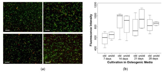 The propidium iodide (PI) test shows the viability of the cells in the presence of coated or uncoated grids. PI can only penetrate damaged cells and alters its fluorescence signal, when intercalating between base pairs of DNA and RNA (Figure 4a). The fluorescence intensity, which correspond to the number of living cells, shows no statistically significant differences between coated and uncoated material. This applies to all differentiation times of 7 to 28 days (Figure 4b).