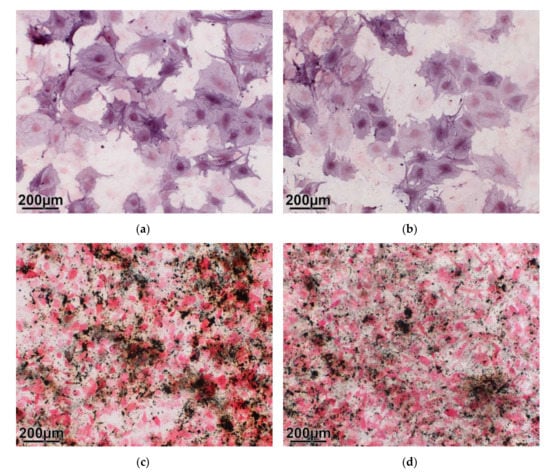Osteogenic differentiation: (a,b) The entire cell surfaces show the enzyme reaction with alkaline phosphatase (violet color). (c,d): The black spots indicate clusters of mineral, which is formed at later stages of osteogenic differentiation (here: 28 days). Coated material (a,c); uncoated material (b,d).