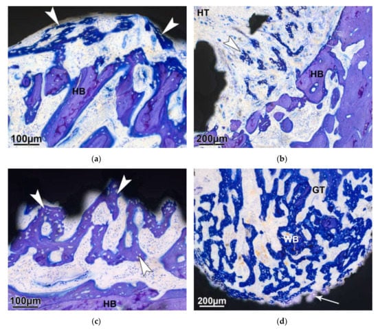 Newly formed woven bone (arrowhead) is visible on the outside of the implant (a: 7days and c: 14 days). (b) At 7 days, woven bone (arrowhead) starts growing through the openings of the implant towards the inside. (d) After 14 days, the cavity is largely filled with newly formed trabeculae, which sometimes develop through enchondral ossification (arrow). Coated implant; HB—host bone; WB—woven bone; HT—hematoma residues; and GT—granulation tissue.