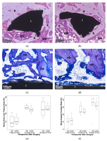 Detailed view of an implant (I) part that is completely consolidated (Hematoxylin-Eosin, 30 days, (a) coated, (b) uncoated; B—bone and BM—bone marrow). Staining with toluidine blue clearly shows the difference between the host bone (HB) outside the defect zone and the newly formed woven bone (arrowhead) in the interface region between bone and implant; (c) coated; (d) uncoated, 7 days. (e) The bone area over tissue area in the defect area plus 100 µm increase noticeably between 7 and 14 days after surgery and stagnates afterwards. There are no statistically significant differences between coated and uncoated implants. (f) During the healing process, an increase in bone-implant contact is visible, but again there is no statistically significant difference between the implant types. ctd—coated; unctd—uncoated.