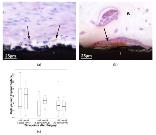 Mononuclear and multinucleated cells stained with ED1 (arrow) are visible on the surface of the implant (I) (a, 14 days, coated and b, 30 days, uncoated). (c) Comparing the number of positive cells among the different time points, no statistically significant difference is evident between the two implant types. ctd—coated and unctd—uncoated.